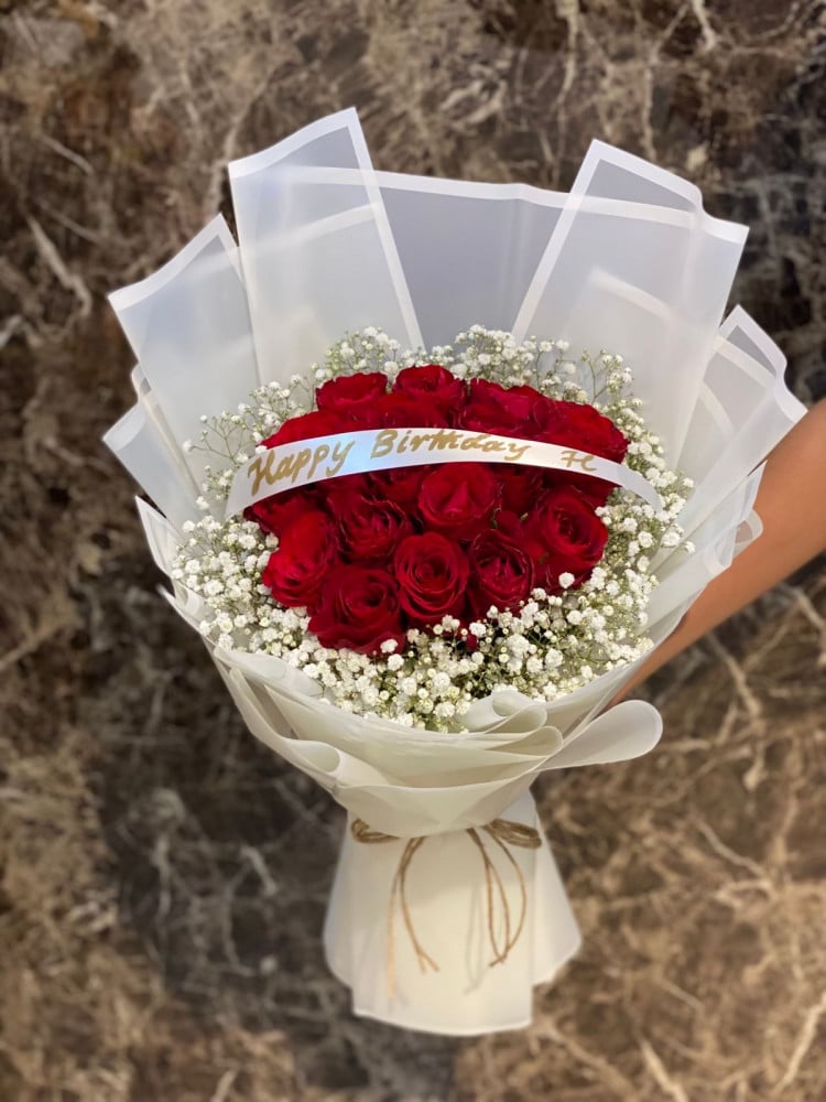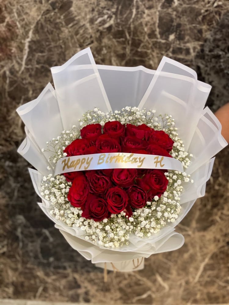 أحمر هدية ساحرة. لون الجوري الأحمر يجعلها تشعر بعمق وصدق حبك وتقديرك لها، حيث أنه لون مرتبط بالعاطفة والمحبة والغلاف الأبيض يعطيها لمسه من الرقة والنعومة ويعزز من لون الورود الرائع، مما يجعل هذه الورود خيارًا مثاليًا كهدية مميزة وصادقة.